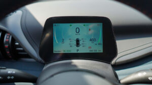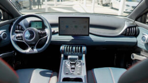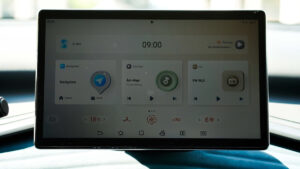 Trung tâm bảng điều khiển là màn hình cảm ứng kích thước 12,8 inch ở bản tiêu chuẩn và 15,6 inch ở bản Premium. Đặc biệt, màn hình này có khả năng xoay 90 độ để hiển thị theo chiều ngang hoặc dọc tùy nhu cầu sử dụng. Phía sau vô-lăng là cụm đồng hồ tốc độ kỹ thuật số LCD kích thước 5 inch, cung cấp thông tin vận hành rõ ràng và trực quan. Nội thất xe còn được trang bị đèn viền trang trí, đèn đọc sách, cùng các cổng sạc USB bố trí ở cả hàng ghế trước và sau.